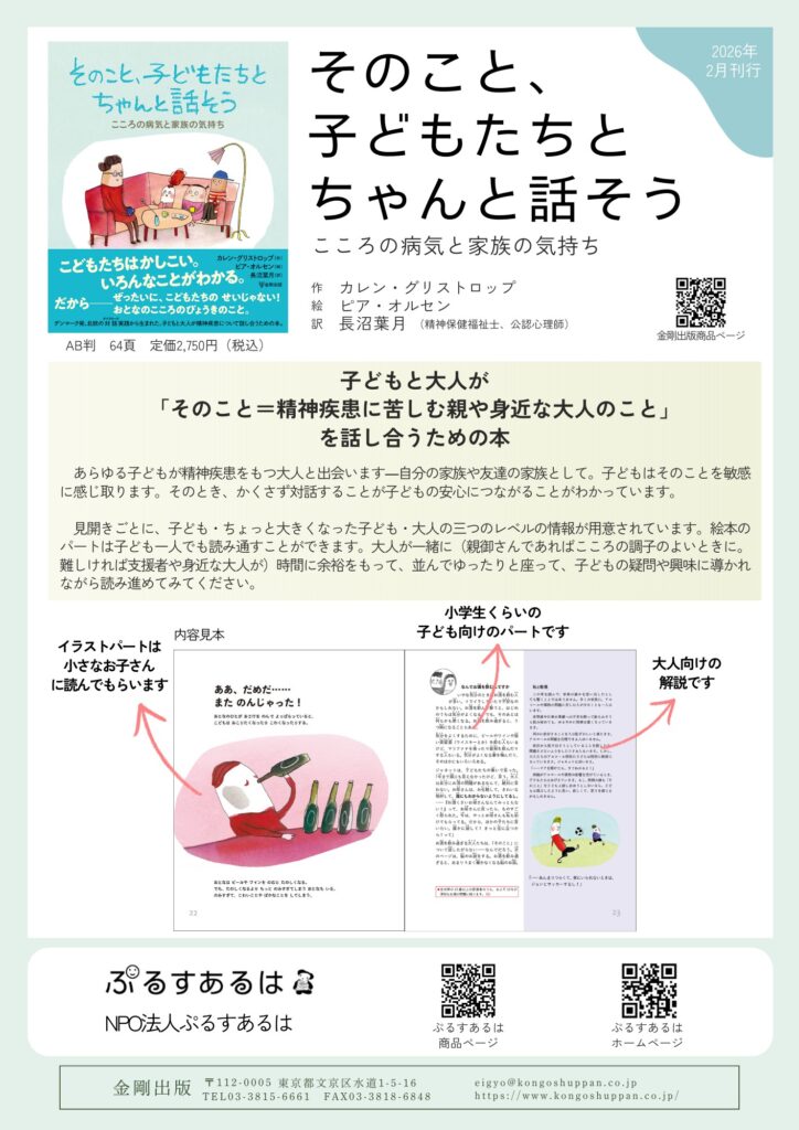 子どもはそのことを敏感[びんかん]に感じ取ります。そのとき、かくさず対話することが子どもの安心につながることがわかっています。デンマークのセラピストによるこの本では、左ページは子ども向けの絵本、右ページは大人が精神疾患[せいしんしっかん]について子どもと話し合うための材料を提供[ていきょう]し、対話をいっしょに進めることができます。
