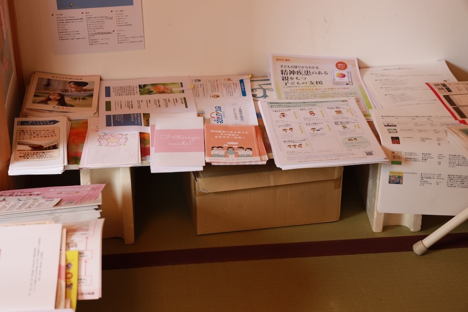 物販と情報コーナー。チラシや体調ポスターのお持ち帰りも人気のゾーンです。
