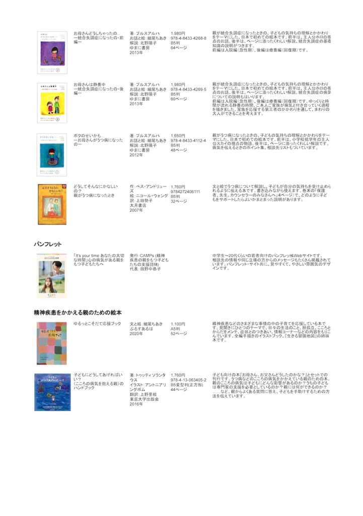 うつ病、統合失調症、アルコール依存症、精神疾患についての絵本など。