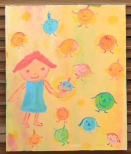 キャンバスの作品は、アクリル絵の具を使って描いています。ときどき絵画展を開催しています。